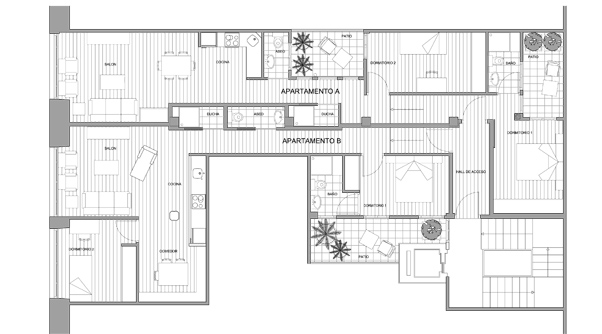 Para ello se prevé la disposición de ambos apartamentos en forma longitudinal y estructurados en base a sendos pasillos de distribución que permiten el acceso a las nuevas estancias.